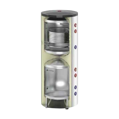 A two-in-one tank, which combines a domestic hot water (DHW) tank and a buffer tank into a single integrated unit, offers multiple advantages by simplifying system design and improving overall efficiency. By merging hot water storage and thermal buffering functions, this solution significantly reduces the space required compared to separate tanks, making it ideal for installations with limited mechanical room space.